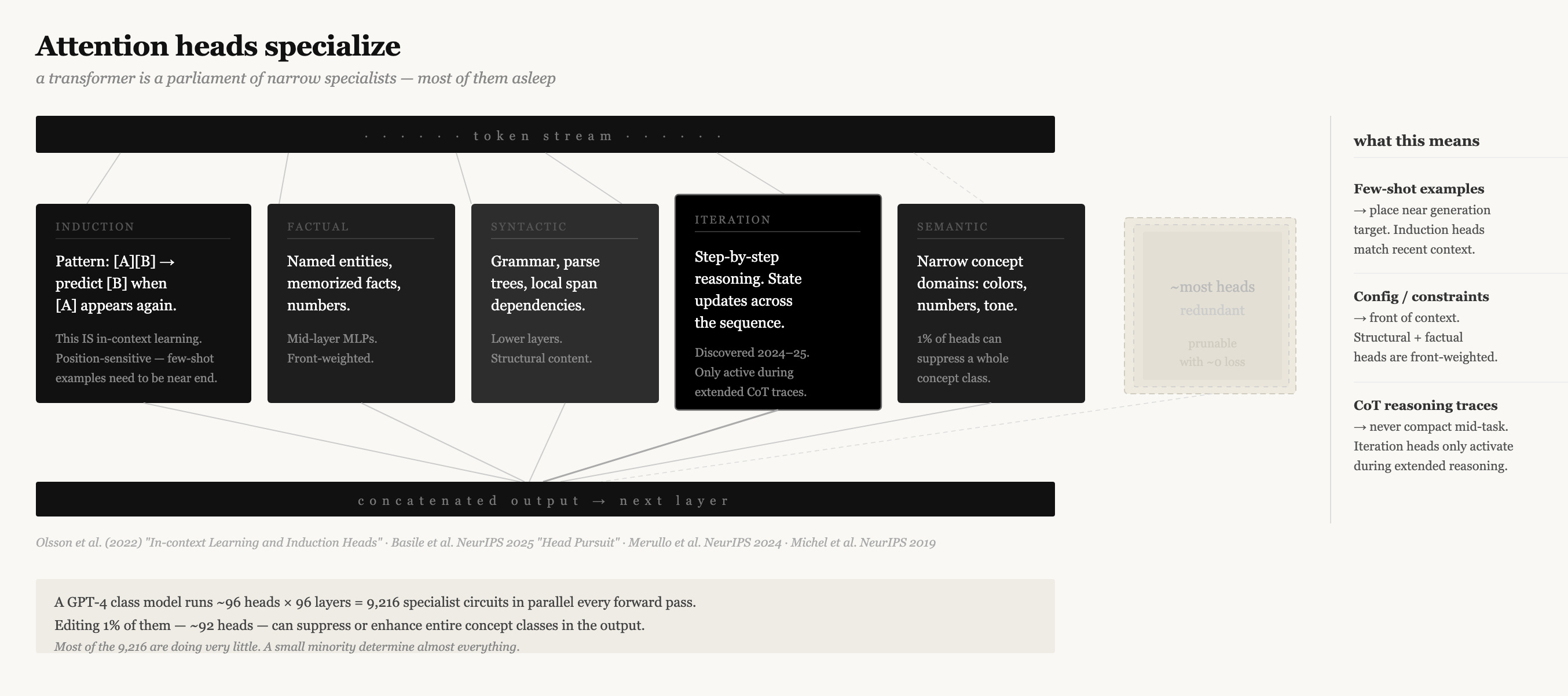 Different heads specialize in dramatically different functions. Some track syntactic structure. Some encode positional relationships. Some do factual recall — they’re the heads that activate when the model needs to retrieve a named entity or a memorized number. A class called “induction heads” (Olsson et al., 2022, one of the most cited papers in mechanistic interpretability) specifically tracks repetition: if a sequence [A][B] appeared earlier in context, induction heads help the model predict [B] when it sees [A] again. This is the mechanism behind in-context learning. Research from NeurIPS 2025 (”Head Pursuit,” Basile et al.) shows specialization extends further than previously known — individual heads reliably represent narrow semantic domains, and selectively editing as few as 1% of heads can suppress or enhance entire concept classes in model output.