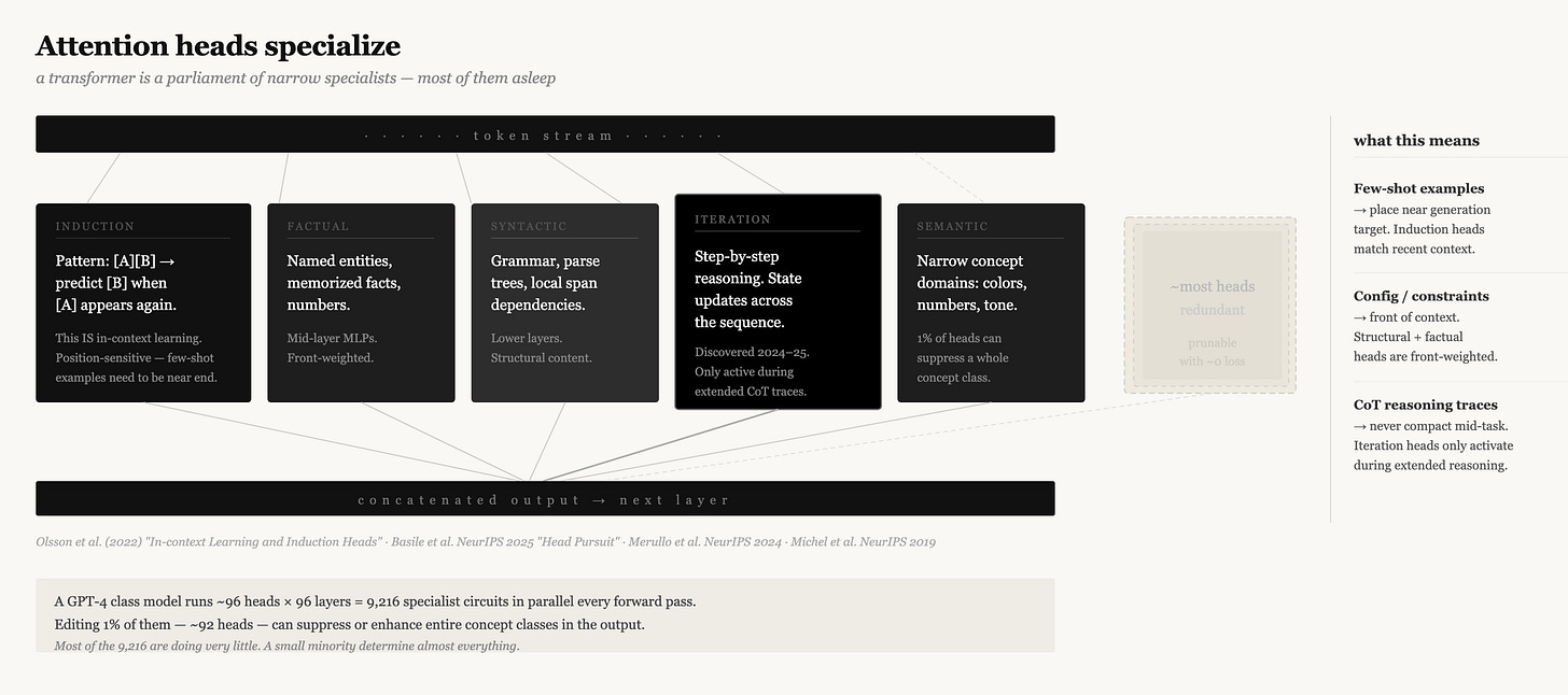 What this means for context engineering is something nobody has fully articulated yet: different kinds of information activate different specialist heads in the model. And the positional biases above apply differently to those specialists.