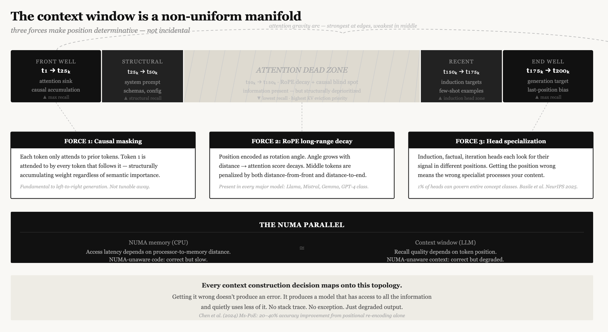 Context engineering today is NUMA-unaware. We stuff tokens into positions without modeling the topology. We retrieve document chunks and inject them wherever is convenient. We construct prompts without asking which specialist heads will process which sections, or whether the thing we most need the model to recall is in the gravitational dead zone.