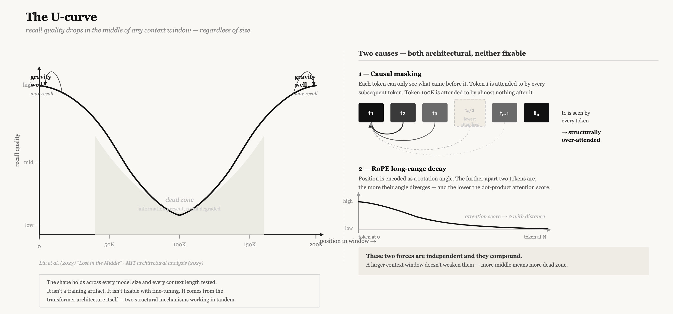 In 2025, MIT researchers traced the U-curve back to something structural — two things that are essentially built into the transformer architecture itself and can’t simply be trained away.