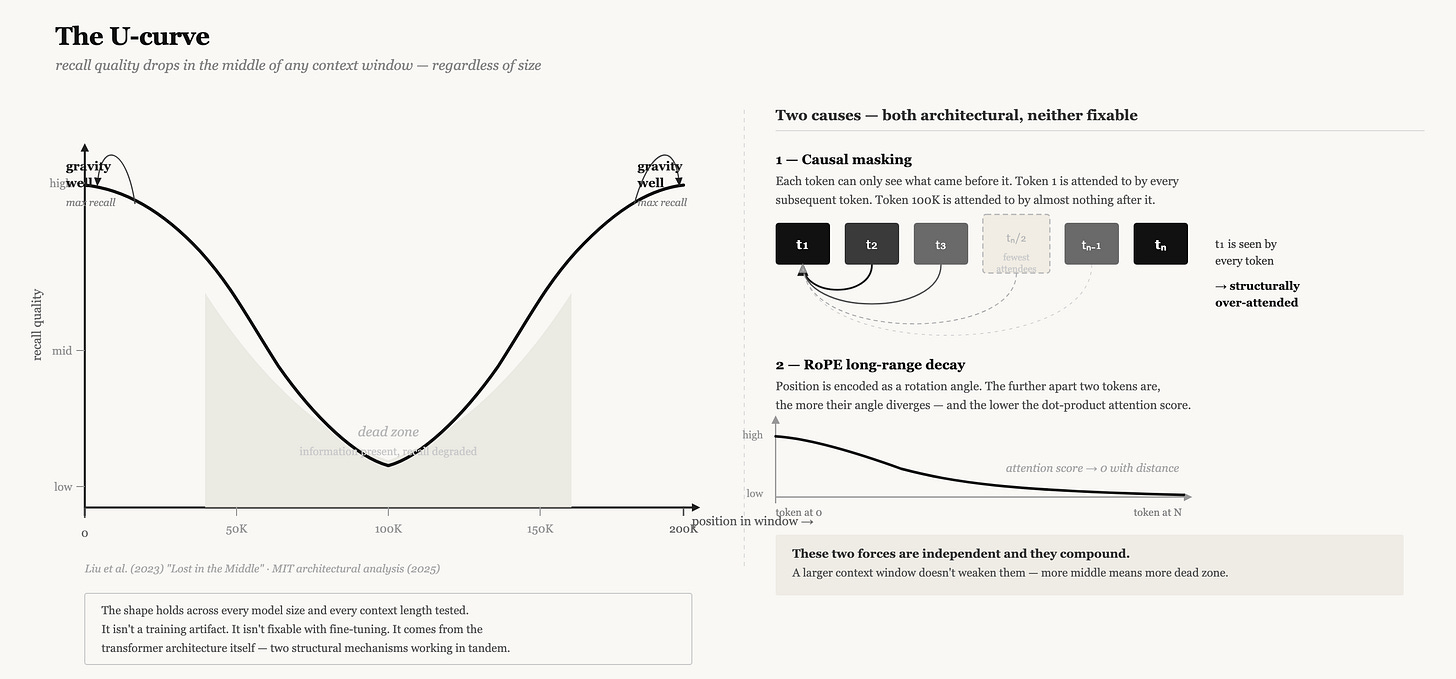 These two effects combine into something that doesn’t go away when you scale the window. A million-token context window doesn’t have less of this problem. It has more of it. There’s just more middle.