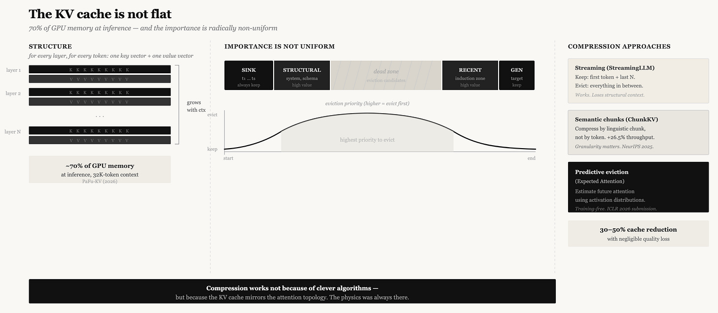 The practical result in inference infrastructure: KV cache compression to 30-50% of full size with negligible quality loss. But the reason this works isn’t magic compression — it’s that the KV cache was never uniformly important in the first place. The physics was always there. We just didn’t have tools to exploit it.