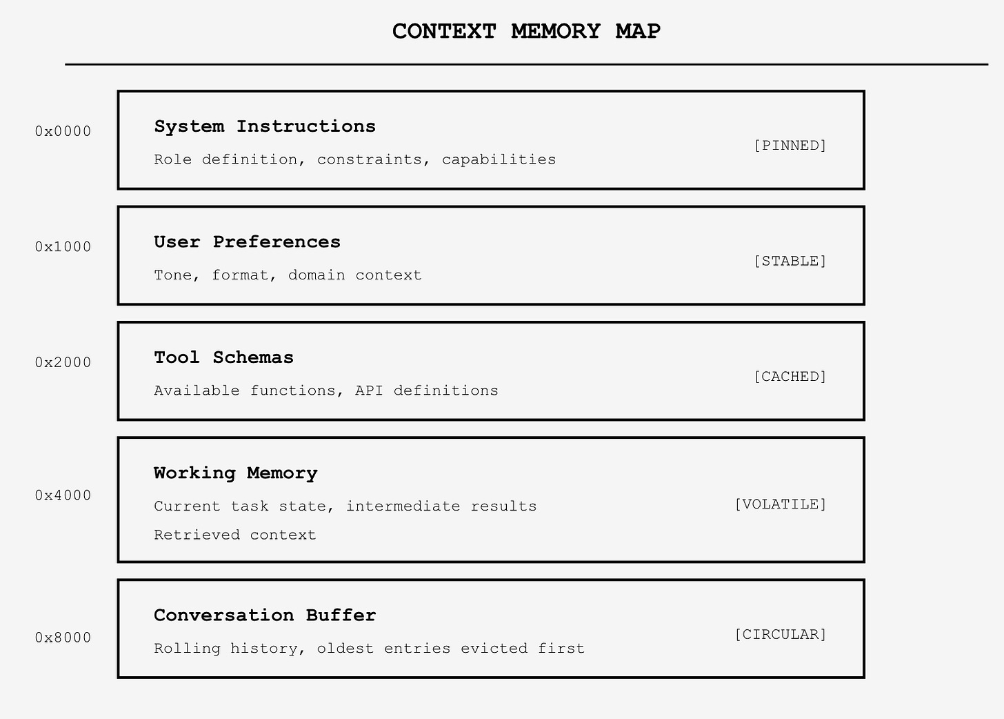 Different regions of context serve different functions. System instructions persist at fixed addresses—they’re loaded first and evicted last. Conversation history occupies a rolling buffer. Tool outputs get injected and then aged out. Retrieved documents get pinned temporarily, then released.