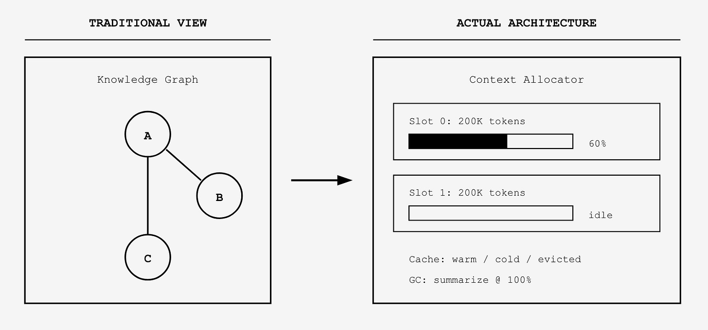 But context management isn’t a graph traversal problem. It’s a resource allocation problem. The questions that matter aren’t “what entities are connected?” but “what fits in working memory right now?” and “what do we evict when we’re full?” and “how do we maintain coherence across multiple execution contexts?”