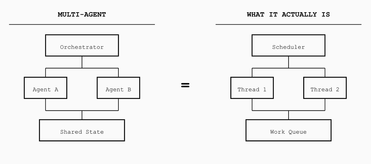 The “orchestrator” agent is just a scheduler. The “tool-calling” mechanism is just syscalls. The “shared memory” between agents is just message passing. We’ve rebuilt concurrent programming from first principles, but with worse tooling.