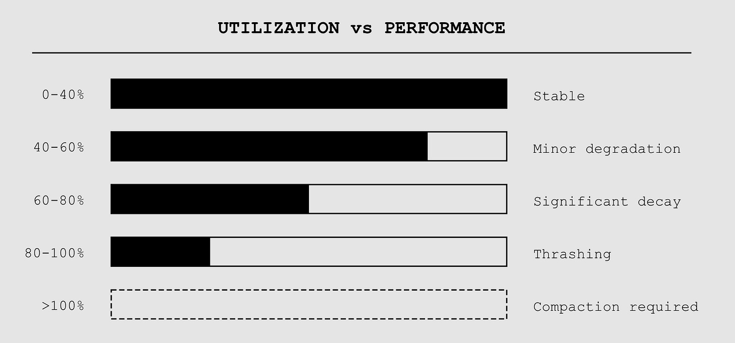 Here’s something the benchmarks don’t tell you. Performance doesn’t degrade linearly with context utilization. It falls off a cliff around 60+% capacity.