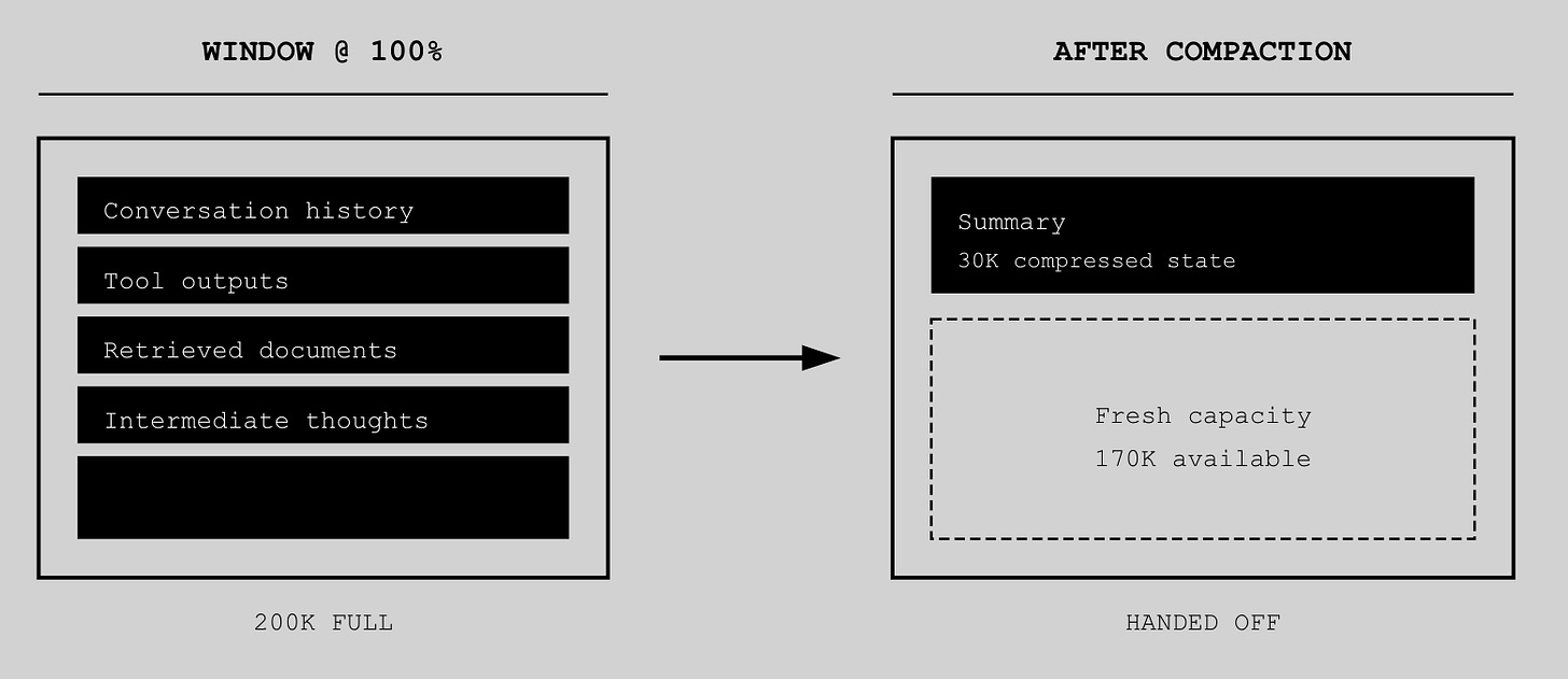 Summarization isn’t a feature—it’s garbage collection. The model distills what it knows, compresses the representation, and hands off to the next allocation unit. A 200K window full of raw conversation becomes a 30K summary that gets loaded into a fresh 200K slot.
