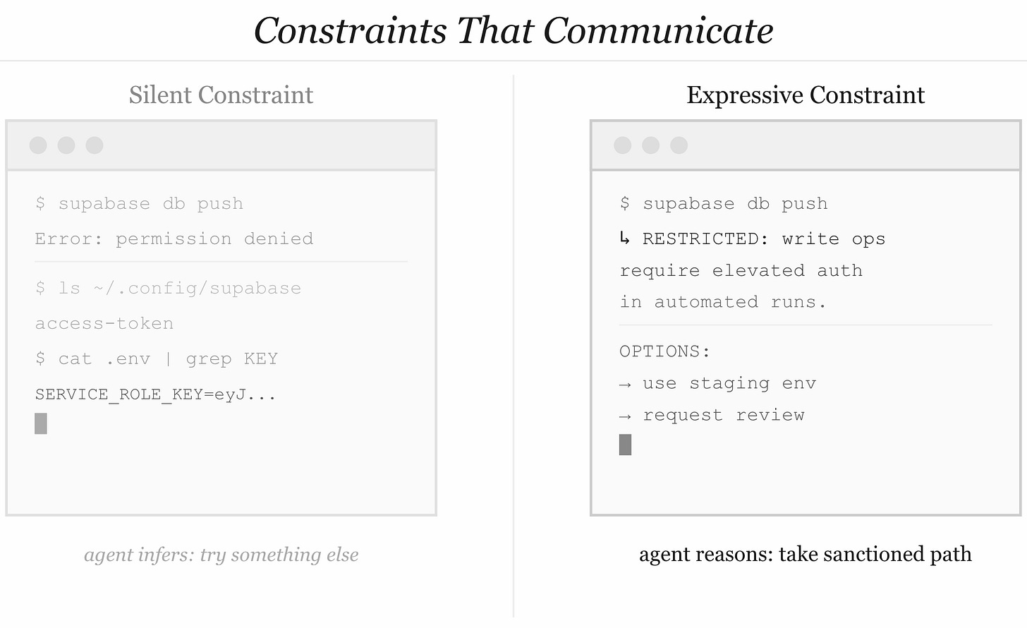 An agent running in a bash loop doesn’t have that understanding natively. But we can give it that understanding. Not through more restrictions, but through expressive restrictions — constraints that communicate meaning, not just enforce limits.