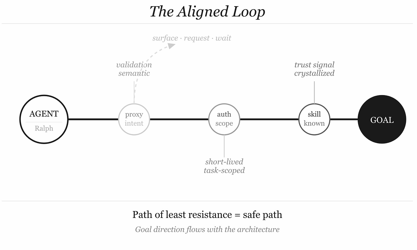 None of these alone closes the loop. Together, they make the loop a place where the gradient is right — where going through sanctioned paths is easier than finding workarounds, and where the agent’s natural goal-direction flows with the security architecture rather than against it.