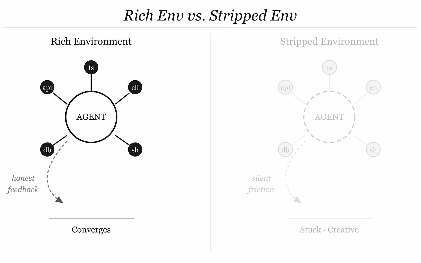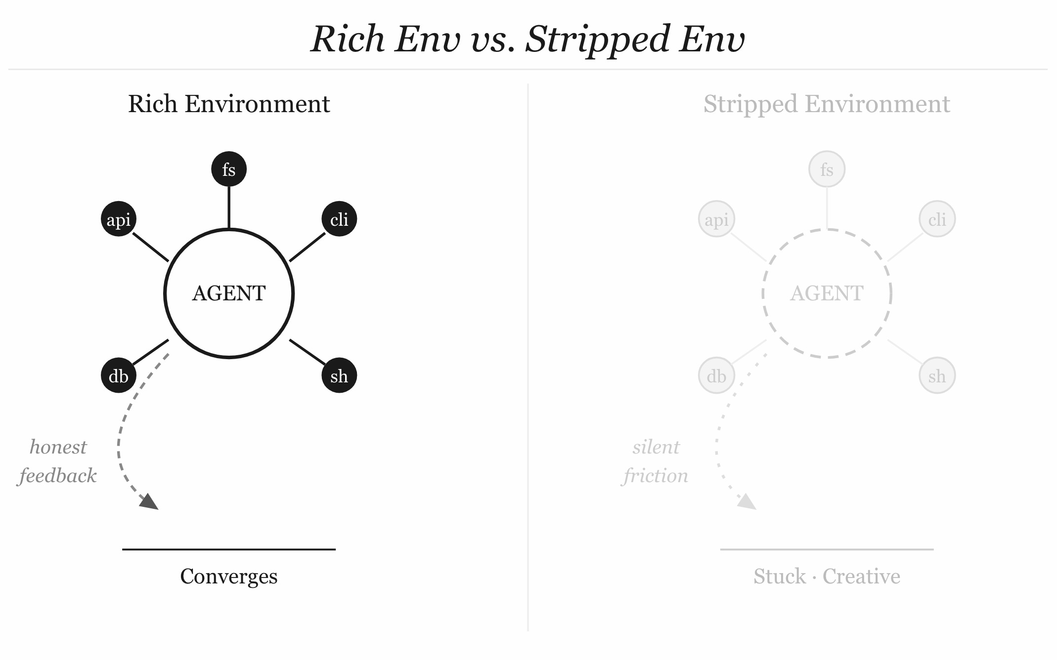 Think about what the Ralph loop’s magic actually is. The agent’s perception surface — the bash environment — is rich. It has real tools. It can read real state. It can run actual tests and get back actual failures. The feedback is honest because the environment is honest. That’s why the loop converges. You strip the environment, you strip the feedback. You proxy every call through a sanitizing layer, you introduce latency and opacity into exactly the information the agent needs to reason well about what to do next.