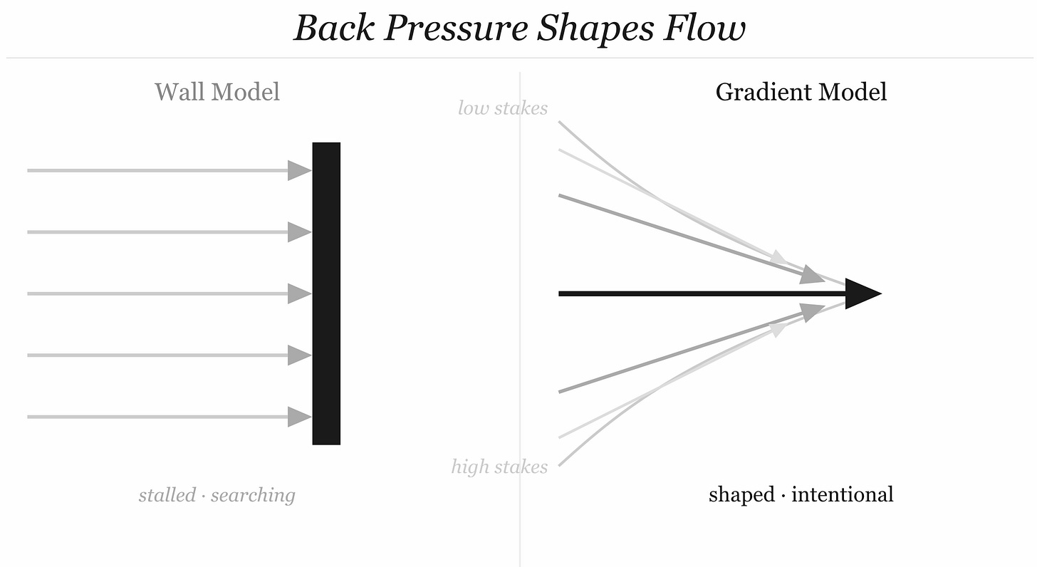 It creates the conditions under which flow happens in a controlled, useful way.