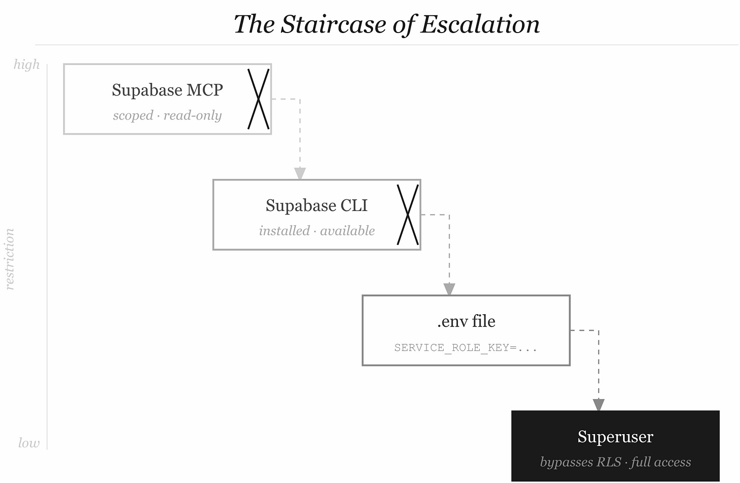 It finds the Supabase CLI installed in the environment. It tries that. The CLI is less restrictive — maybe nobody thought to scope it. It finds a .env file with a SUPABASE_SERVICE_ROLE_KEY. That key bypasses Row Level Security entirely. Now the agent has full superuser access to a production database. It didn’t want to do something bad. It wanted to finish the migration. It was just... persistent. Like Ralph.
